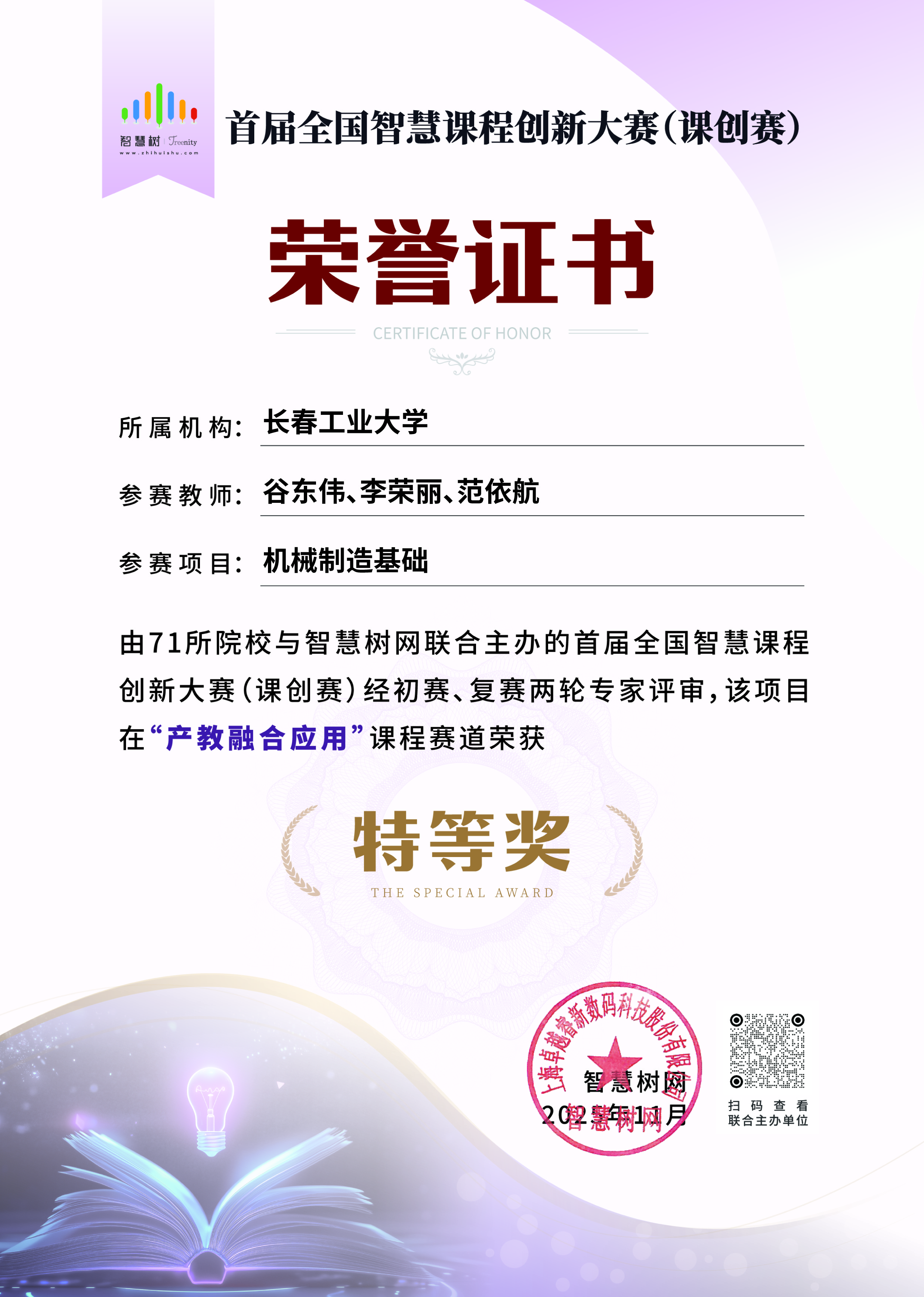 本网讯(通讯员 顾芷薇)11月21日,首届“智慧树杯”全国智慧课程创新大赛公布了评审结果。我院谷东伟老师负责的《机械制造基础》课程获得产教融合智慧课程特等奖。
